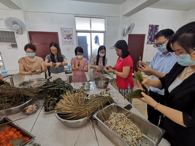 活動(dòng)現(xiàn)場準(zhǔn)備了糯米、粽葉、板栗、蛋黃等材料,大家圍在一起,從嘗試、普及到大展身手,歡聲笑語、棕葉飄香,參與人員包得不亦樂乎。