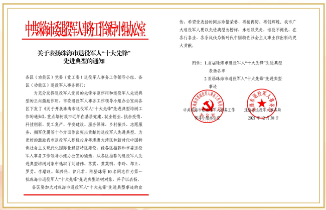 2022年4月26日,接珠海市委退役軍人事務(wù)工作領(lǐng)導(dǎo)小組辦公室通知,珠海聯(lián)港城市建設(shè)管理有限公司總經(jīng)理李增旺獲評(píng)“珠海市退役軍人十大先鋒—復(fù)工復(fù)產(chǎn)先鋒”。