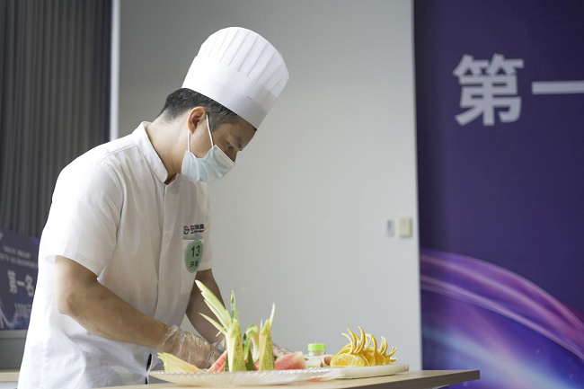 參與環(huán)境技能展示的13位員工來(lái)自公司各個(gè)項(xiàng)目,12名保潔人員展示了日常工作禮儀,塵推技能,來(lái)自規(guī)劃館飯?zhí)玫膹N師江火明現(xiàn)場(chǎng)制作了精美的果盤,得到了評(píng)委和觀眾一致好評(píng)。